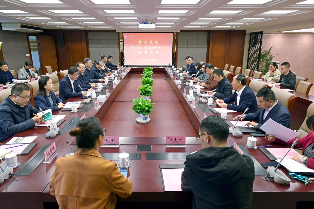10月21日上午,宿迁学院党委书记徐德、校长刘志远率党政代表团,洋河酒厂股份有限公司党委书记、董事长张联东,副总裁周新虎一行20余人来校考察调研。江南大学党委副书记符惠明、戴月波,副校长张影陆,以及相关部门、学院负责同志参加座谈交流。座谈会在行政楼B305会议室举行,由党委常委、党委办公室主任朱飞主持。
